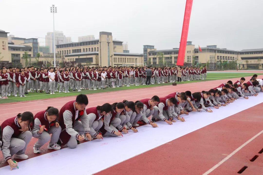 之后,師生們來到了百米長卷面前,用筆墨書寫了心聲和誓言。大家不忘初心,牢記使命。主席臺上,高一年級的張詩琪、曾伊萌、孔令羽和鄭暢同學為我們帶來了歌曲演唱《最初的夢想》。歌聲飄蕩在衡川運動場的上空,最初的夢想永遠在我們心中。